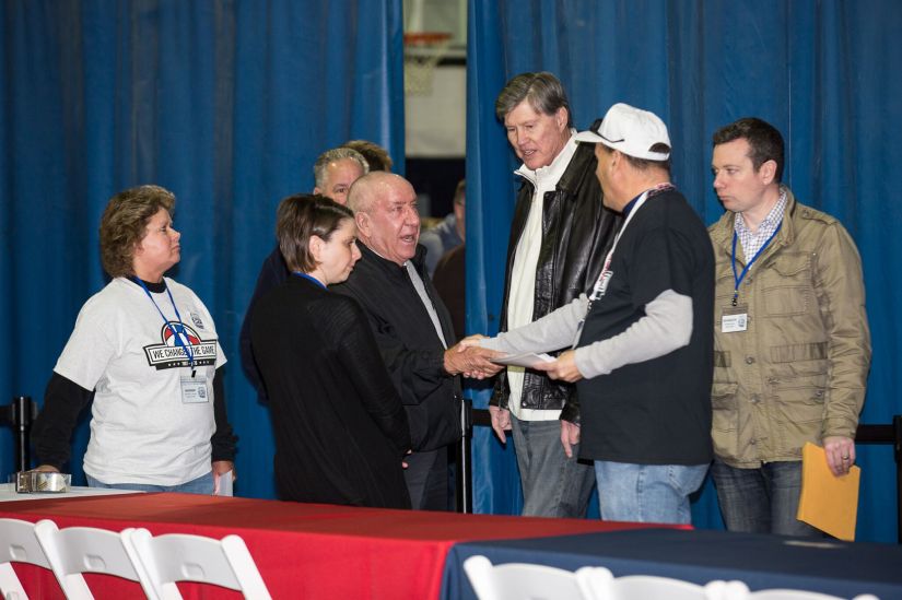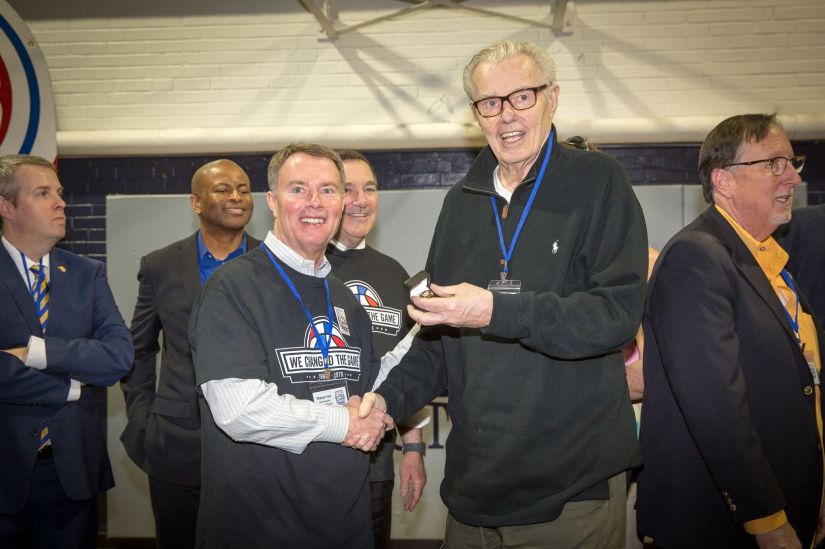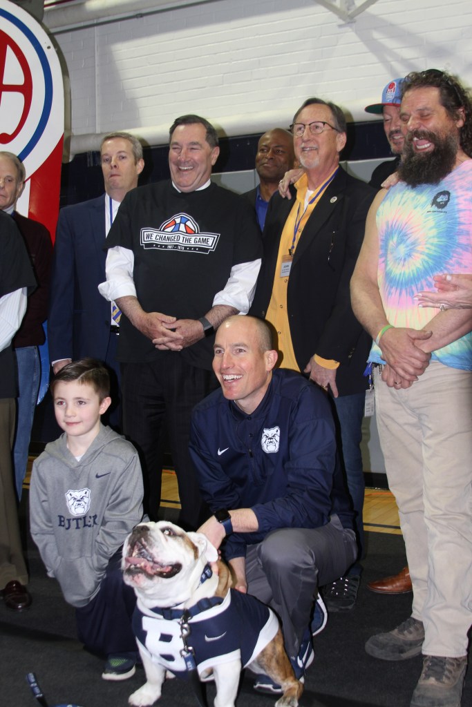 To make the event even more meaningful for the players and fans in attendance, several local dignitaries volunteered as honorary guest ring presenters. Senator Joe Donnelly, Congresswoman Susan Brooks, Mayor Joe Hogsett, City Councillors Vop Osili and Michael McQuillen, newscaster Dick Wolfsie, Trip III (the Butler “Blue” Bulldog) and even Rupert Boneham from Survivor showed up to pass out the iron. Former Q-95 regular Dave “The King” Wilson announced each player individually to the delight of the estimated 1,000 friends, fans and family of the ABA honorees.