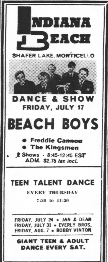 The Indiana Beach ballroom also hosted hundreds of other performances, including legendary big bands who drew massive crowds in the 1940s. Records from most of those performances at the Lake Shafer amusement park in the 1940s and early 1950s are sketchy at best. Some played more than one night, an entire weekend, a whole week of shows or even stayed and played for a month. Those acts included Glenn Miller June 1940-Benny Goodman June 25, 1941-Louis Armstrong June 12, 1955 and again on July 27, 1962-Tommy and Jimmy Dorsey June 28, 1955; Aug. 1, 1956-Dave Brubeck July 3, 1956-Bill Haley & the Comets May 31, 1957 & June 22, 1962 and Duke Ellington Aug. 20, 1957. The “Heart-throbs” and “Folkies” were well represented too with acts like Fabian, Ricky Nelson, Peter, Paul and Mary and the Kingston Trio.