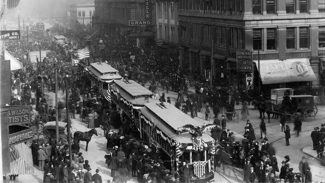 That 1893 visit culminated with a viewing at the Indiana State House where former President Benjamin Harrison delivered a speech honoring the bell. During the celebration, children from the Indianapolis Blind School were permitted to “get the sense of sight through the joy of touch. They fingered the beloved relic and went back to school fully satisfied.” The second visit of the Liberty Bell came on November 17, 1904, on its way back to Philly from the Louisiana Purchase Exposition aka the St. Louis World’s Fair. Sadly, the bell’s 6 p.m. arrival at the intersection of West and Washington Streets occurred the same day that the historic landmark Meridian Street Methodist Episcopal Church burnt to the ground nearby. The poet James Whitcomb Riley was among the official greeters for that 1904 visit. The Liberty Bell was on display at the interurban train sheds and Ohio Street traction station through the night, leaving the next morning. The culmination was a parade of all Indianapolis Public School children to the interurban station where they marched in front of the cherished relic to music provided by the Indianapolis News Newsboys Band. The Indianapolis News reported that the scene “moved grownups to tears and brought a full realization of the patriotic value of The Liberty Bell.” The bell was removed to the train station and sent on its way back to Philadelphia “almost buried under chrysanthemums that had been provided by patriotic citizens. As the car passed westward on Washington Street, the school children strewed the track with flowers.”