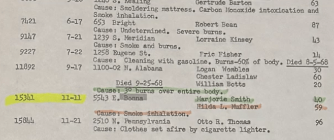The article further reports, “An employee, Jack Miller, 56, 250 Audubon Circle, said he was seated at his desk and heard a crackling sound. He looked at a nearby thermostat and said he saw sparks flying from the mechanism. Miller said he ran into another room to get a fire extinguisher, but when he returned, the sparks had ignited stacks of latex foam rubber nearby. There was nothing I could do with the fire extinguisher by the time I got back. It was out of control.” Another Star article quotes Miller as saying he saw a “flash of lightning” come from the wall thermostat and strike a pile of foam. Deputy Marion County Coroner and chief of the fire prevention bureau, Donald E. Bollinger, said the victim’s bodies suffered no burns and were found lying face down perpendicular, one atop the other, in the one-story concrete block plant. The women were found within 4 feet of an office door and only 8 feet from the nearest exit door.