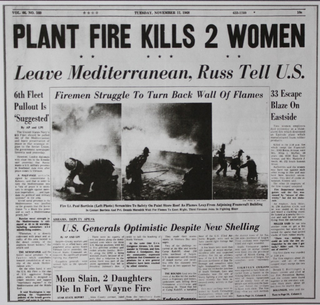 The factory site was visited by tragedy in the autumn of 1968. The front page of the November 12, 1968, Indy News announced “Plant Fire Kills Two Women. 33 Escape Blaze on Eastside.” At 3:34 in the afternoon, firefighters responded to a three-alarm fire at the Foamcraft factory plant. Mrs. Hilda F. Muffler, 59, of 6550 East Troy Avenue, and Mrs. Marjorie J. Smith, 40, of 152 South Summit Street, were killed in the blaze. Mrs. Muffler was employed as a seamstress, and Mrs. Smith as a cutter. Authorities theorized that the two women may have collided and been knocked unconscious during the frenzy to escape the fire. The women died of smoke inhalation and heat. According to the article, Fire Department investigators said the fire was caused by ‘misuse of electricity,’ but did not elaborate.