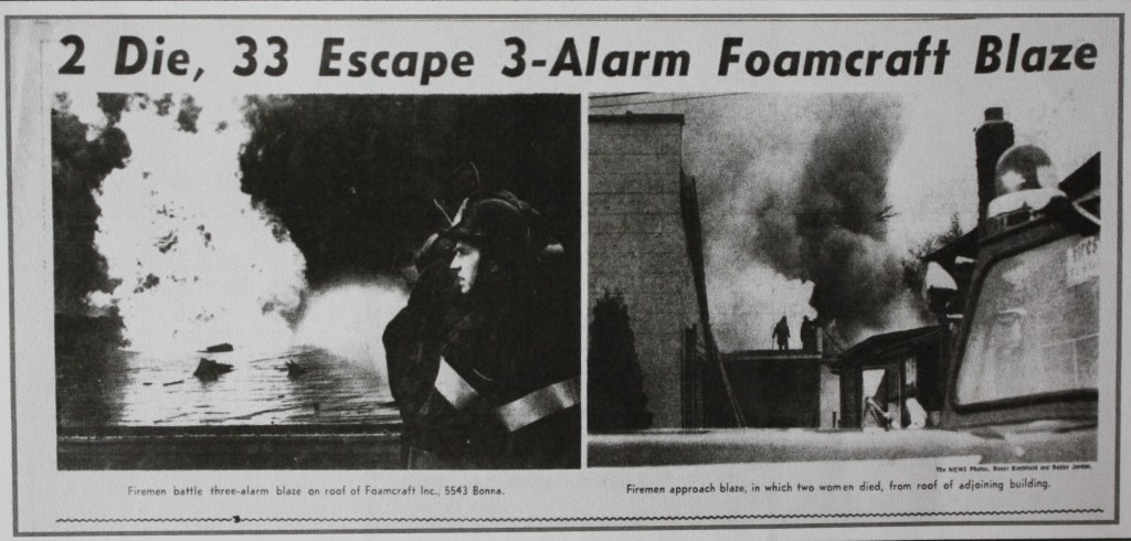 The Foamcraft building was destroyed in the inferno. Investigators determined the fire started along the north wall of the “blackened pillow room” on the northeast corner of the building. Deputy Chief Bollinger later speculated that the fire could have been prevented if the wall receptacle box, which contained the mechanism controlling the heating blowers, had been properly covered. One unnamed employee told Bollinger that he tried to make a metal cover for the box the week before the blaze, but was shocked during the attempted installation and was unable to do so. That same employee said that he had informed company officials of the problem, but it had not been fixed yet.